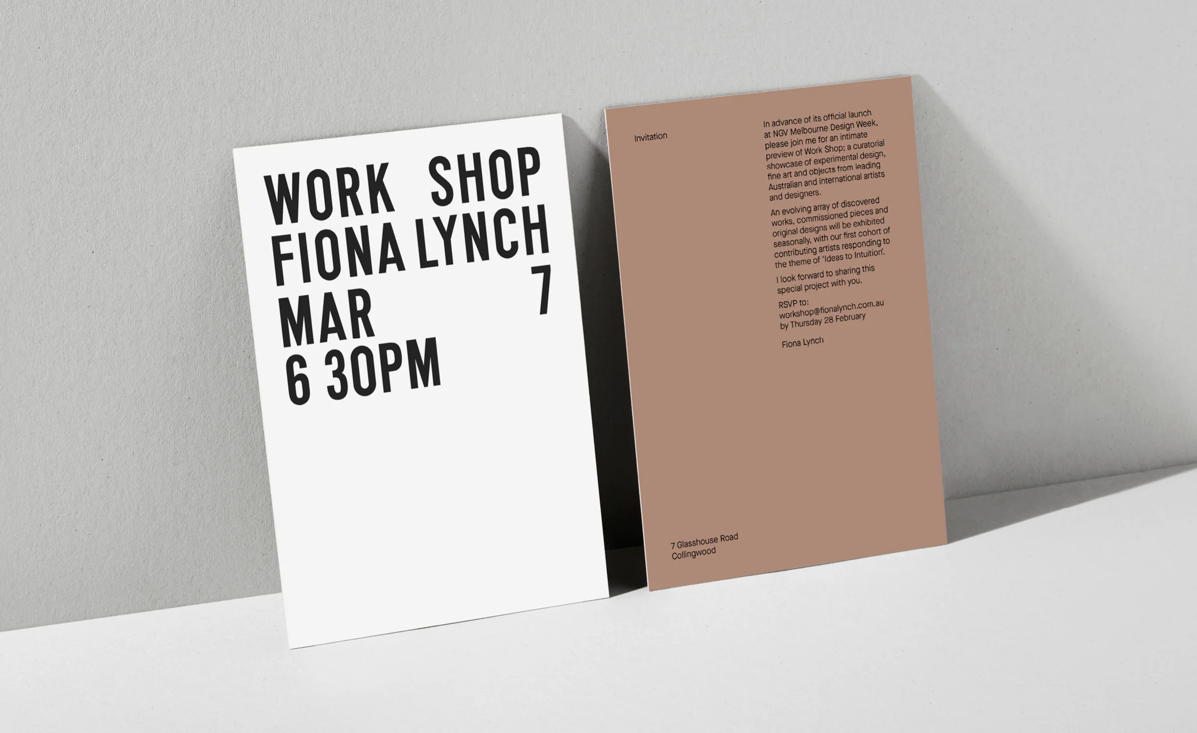 Working within the Fiona Lynch Office brand system, Clear created the identity for Work Shop as a natural evolution, forming a new design system to promote the ephemeral gallery space. The Fiona Lynch Work Shop brand is a foundation for core elements of colour and texture, for the work of exhibited artists and makers to hold prominence.